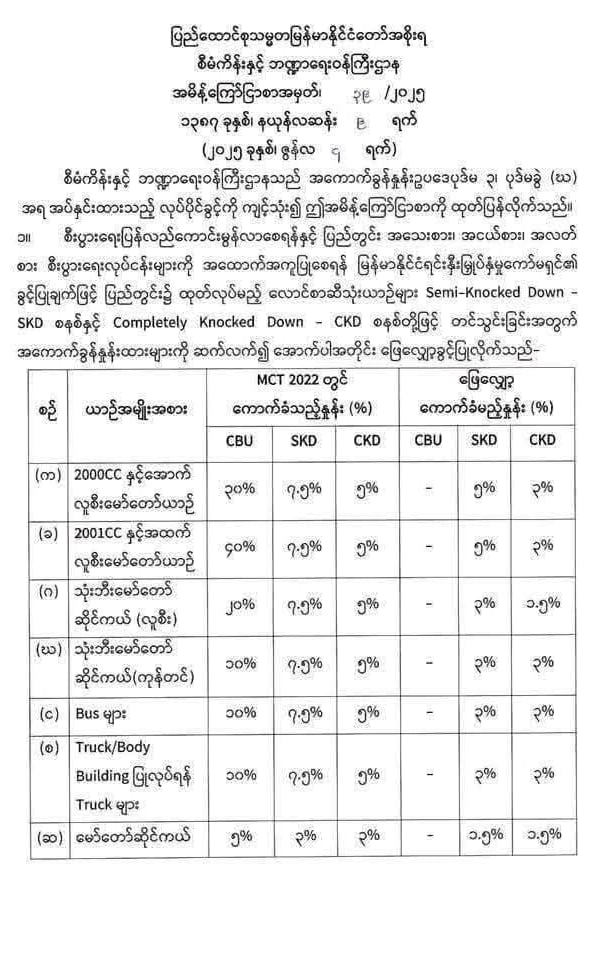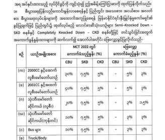 ミャンマー計画・財務省は、国内で製造される燃料車、およびSemi-Knocked Down(SKD)方式とCompletely Knocked Down(CKD)方式で輸入される車両に対して、関税率を引き下げると発表しました。